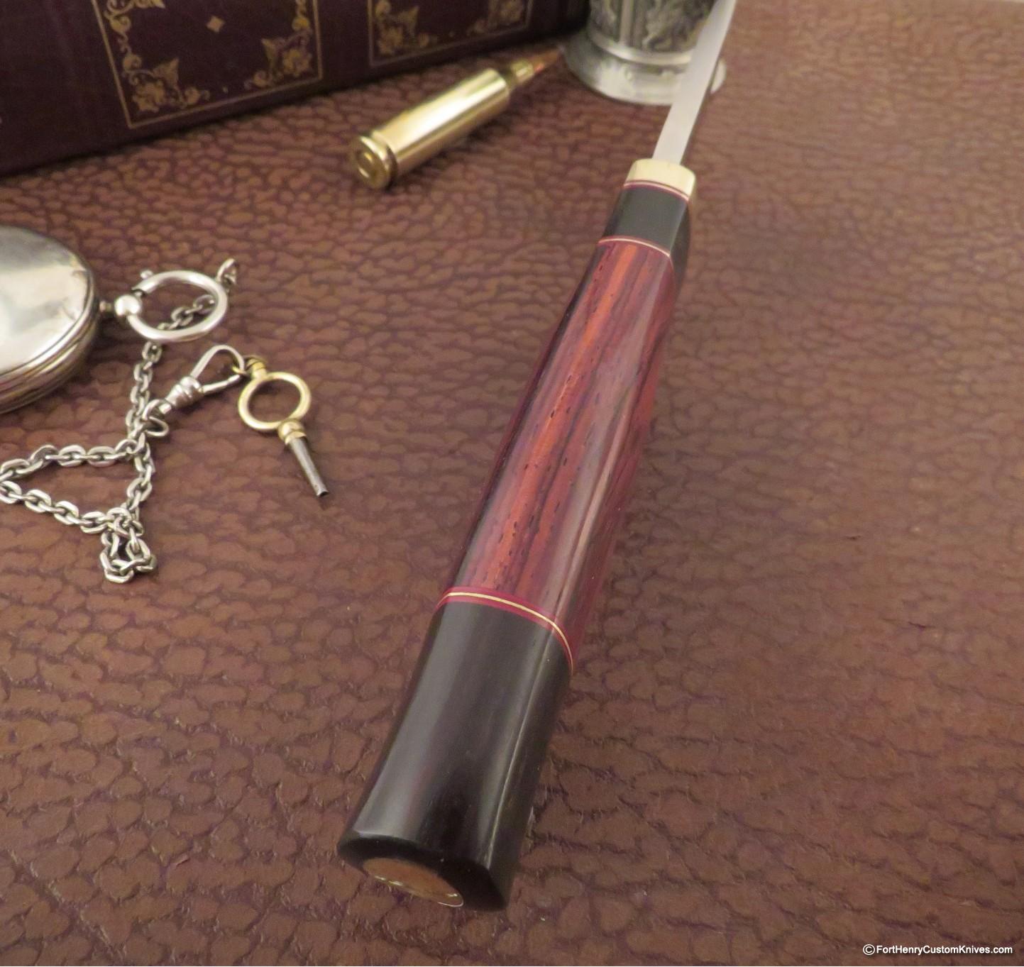 Through Decades of Experience Bob has refined the Contouring of his handles to be both Secure and Comfortable. The Expertly Contoured Cocobolo is separated by Red & Brass Spacers and it has bookends crafted of African Blackwood ~ all Screwed onto the Tang Bolt.