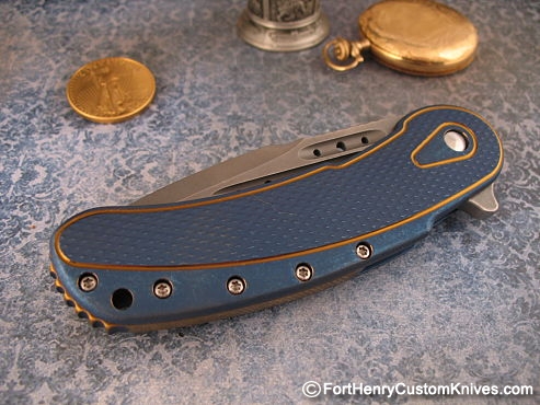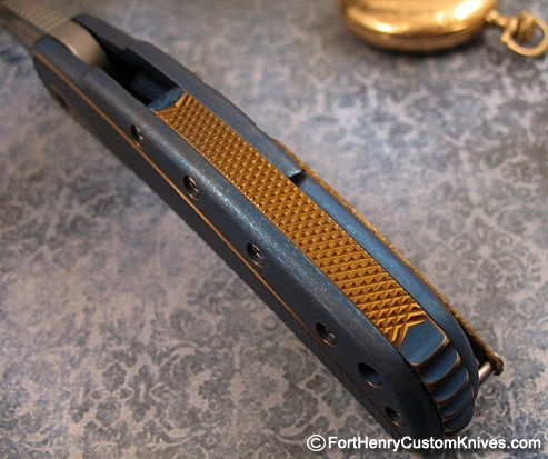 The beautifully Anodized Full Titanium construction helps to lighten the weight of this big knife. This one also is Anodized Gold on the Clip and Anodized Blue on the inside of the Backapacer.