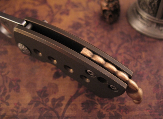 This is one of Jon’s most popular designs ~ an incredibly Small Framelock that Sypderco picked up and produced last year. Fort Henry Custom Knives has added a Custom Stonewashed Finish with Two Tone Bronze Anodizing and a Bronze Stinger for a dramatic new look!