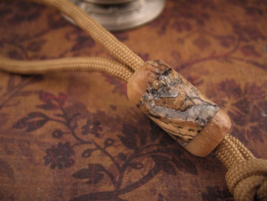 Courtney Turnage has taken his talent for Jewelry Making and combined it with his Father’s Mammoth material supply to make some really unique pieces. This is a New Mammoth Molar Lanyard Bead is an item for those that enjoy something very unique and I feel it would dress up any Knife it was attached to.