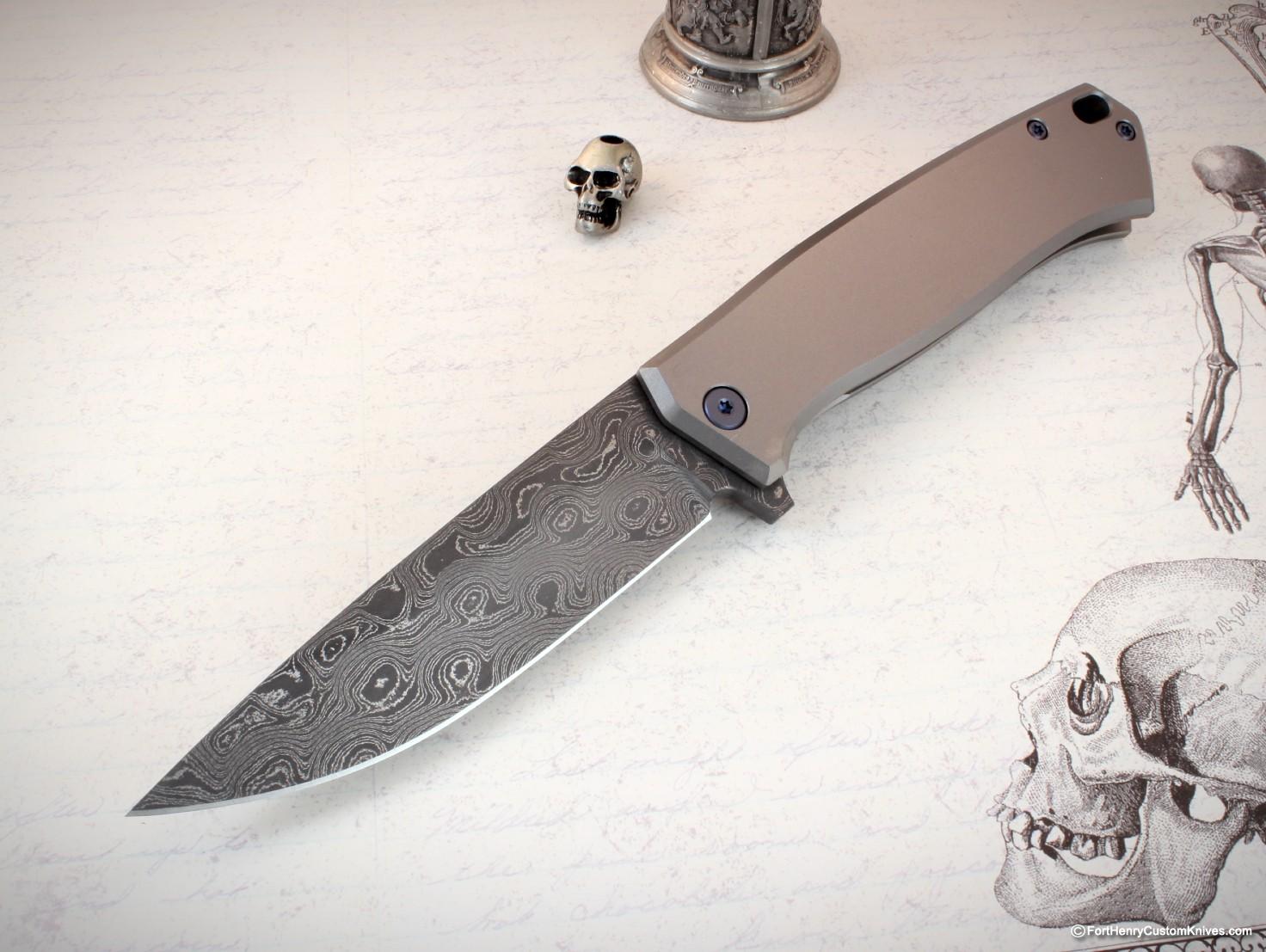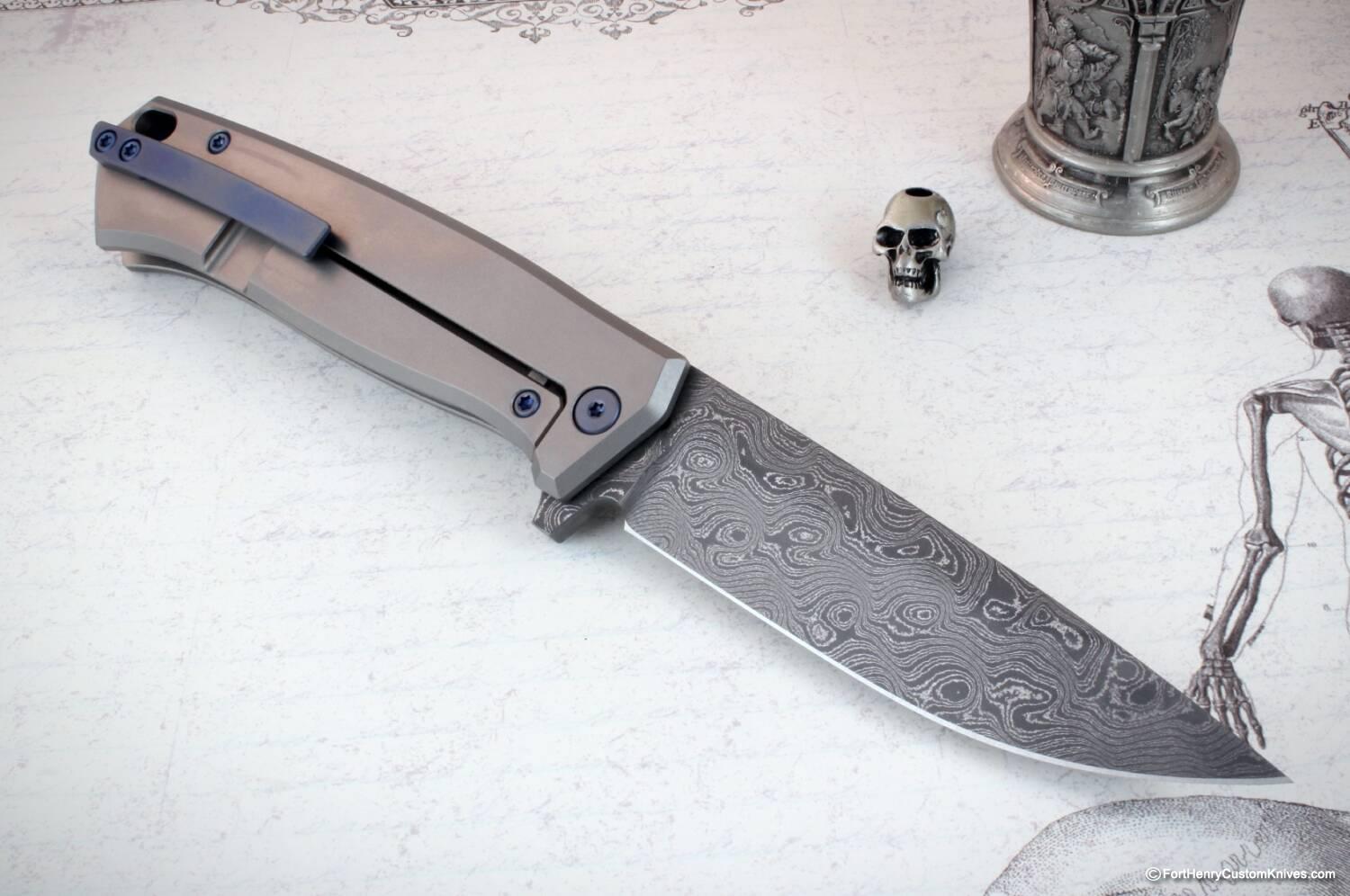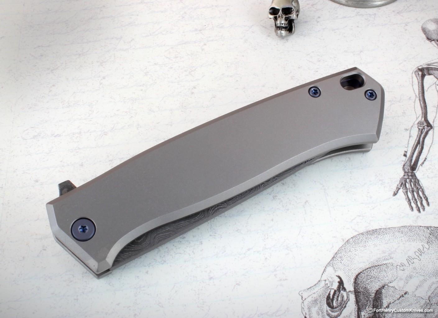 This is his extremely popular, now Discontinued Arsen flipper. The sleek profile when open reminds one of a fine sportscar. The Full Size Contoured Titanium Frame has been given a unique Subtle Finish. The smoothness of the Flipping action is sure to put a smile on your face! The knife has a superb Detent, along with the Internal Ceramic Bearing system and excellent Balance of the blade – this knife flips effortlessly. The Nichols Raindrop Damascus Blade on this Kamil Dlugosz Arsen has a Precise Grind one of the best Etched finishes that I have ever seen. Extremely nice action, the lock up is consistent ~ early and secure. Kamil also gave this one a Thick, Half Length Titanium Backspacer to add strength to the frame without adding a lot of weight. The backside of the Frame is Flat to ride snugly in your pocket. The low rider Titanium pocket clip is set for Tip Up carry.