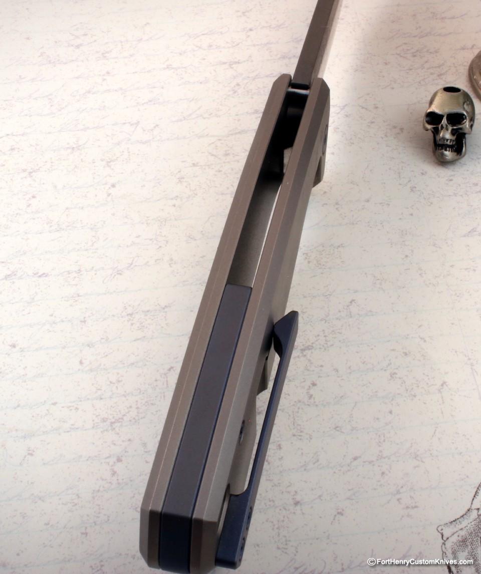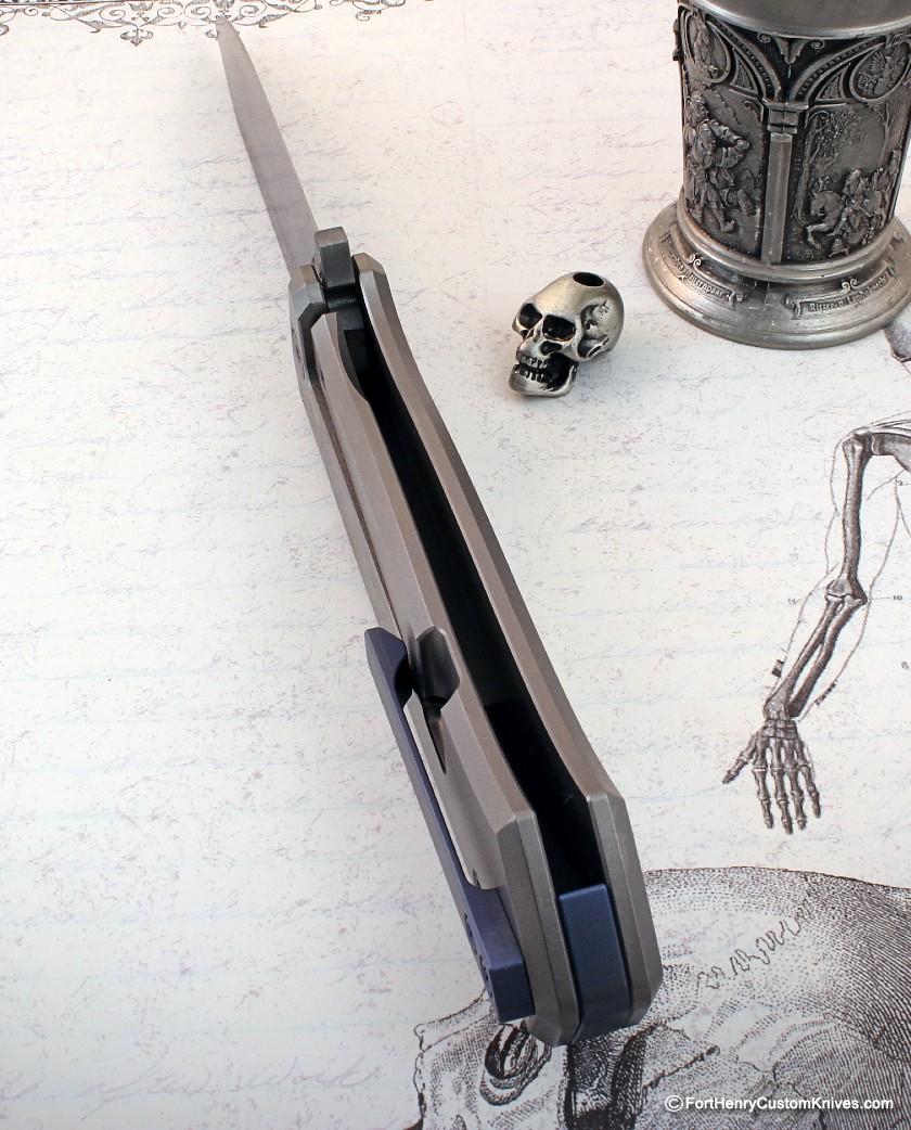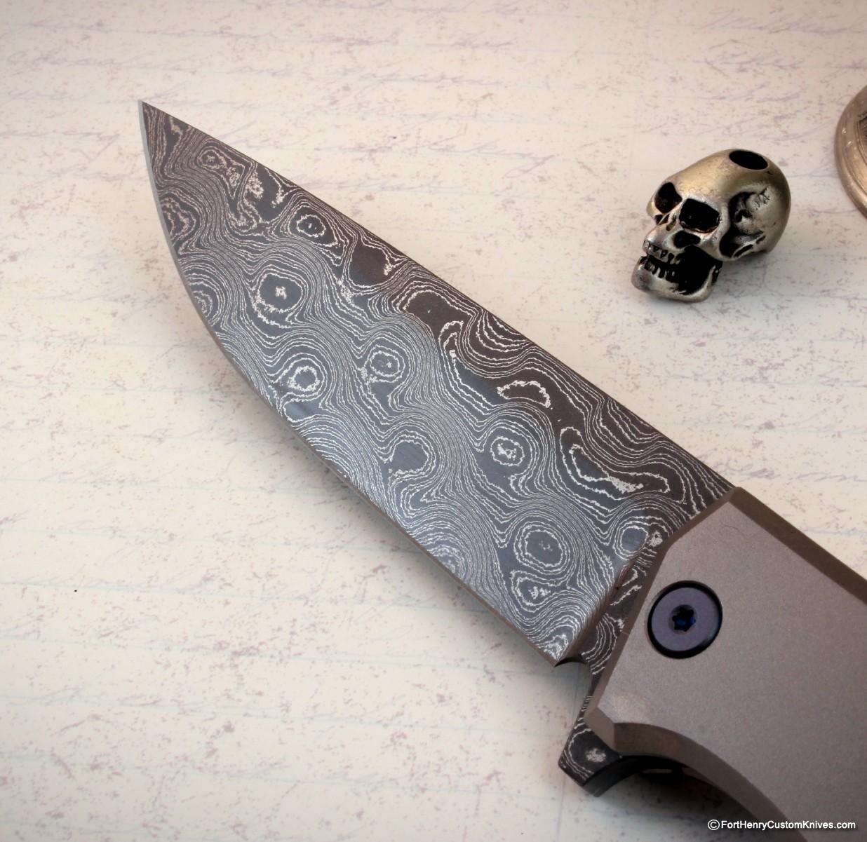 This is his extremely popular, now Discontinued Arsen flipper. The sleek profile when open reminds one of a fine sportscar. The Full Size Contoured Titanium Frame has been given a unique Subtle Finish. The smoothness of the Flipping action is sure to put a smile on your face! The knife has a superb Detent, along with the Internal Ceramic Bearing system and excellent Balance of the blade – this knife flips effortlessly. The Nichols Raindrop Damascus Blade on this Kamil Dlugosz Arsen has a Precise Grind one of the best Etched finishes that I have ever seen. Extremely nice action, the lock up is consistent ~ early and secure. Kamil also gave this one a Thick, Half Length Titanium Backspacer to add strength to the frame without adding a lot of weight. The backside of the Frame is Flat to ride snugly in your pocket. The low rider Titanium pocket clip is set for Tip Up carry.