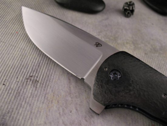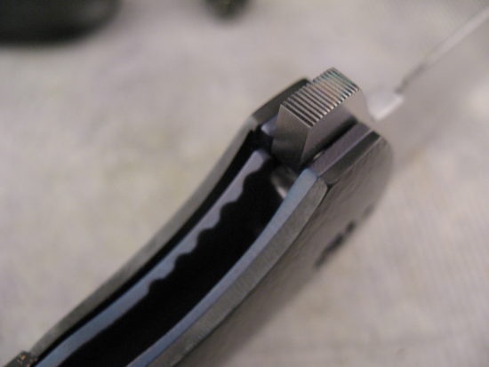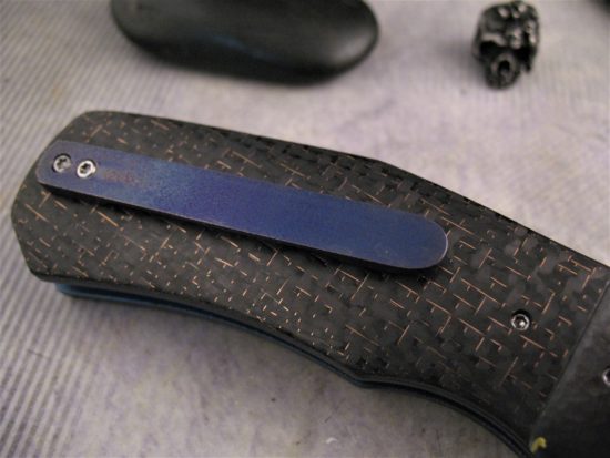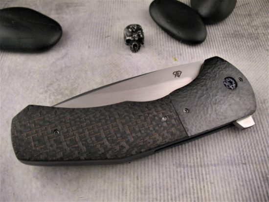 The Handle Scales are a Lightening Strike Carbon Fiber with Hammered Zirconium Bolsters and a Near Full Length matching Backspacer which gives this frame design added Strength.