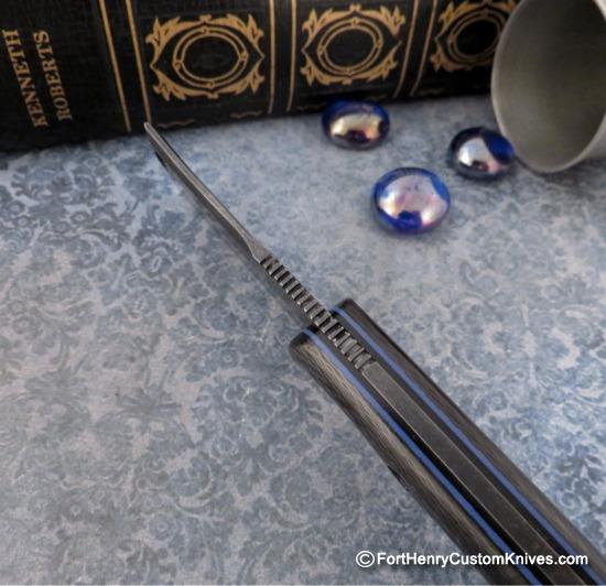 Very Light yet Rugged, this is a Full Tang knife that will make short work of any EDC chore. Lightweight Carbon Fiber handle scales with Custom Blue G-10 Liners.