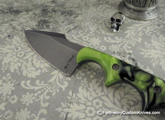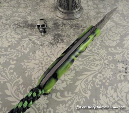One of the most eye catching features of this Alan Folts Harpoon Minimalist is the Unique Blade Grind ~ the Thumb falls naturally into the Recess just behind the top of the Harpoon. The Toxic Green Swirl Kirinite handles really make this a unique looking package.
