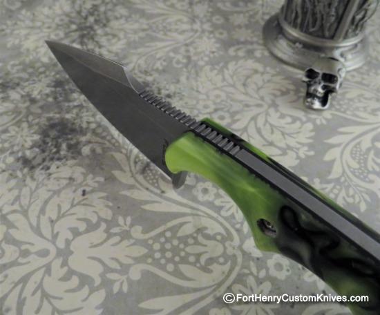 One of the most eye catching features of this Alan Folts Harpoon Minimalist is the Unique Blade Grind ~ the Thumb falls naturally into the Recess just behind the top of the Harpoon. The Toxic Green Swirl Kirinite handles really make this a unique looking package.