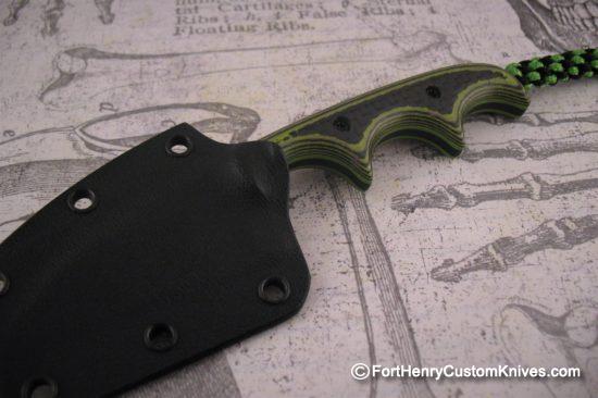 This blade has a Precision Wharncliff Grind, Full Tang with Toxic Green G-10 Liners