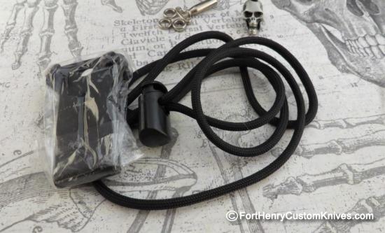 Secure Custom Matching Kydex Neck Sheath with plenty of Paracord and Adjustable keeper, very easy to carry with no noticeable imprint under a T Shirt.