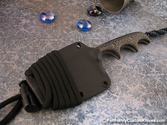 Secure Custom Matching Kydex Neck Sheath with plenty of Paracord and Adjustable keeper, very easy to carry with no noticeable imprint under a T Shirt.