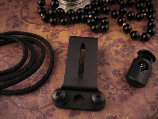 Secure Custom Matching Kydex Neck Sheath with plenty of Paracord and Adjustable keeper, very easy to carry with no noticeable imprint under a T Shirt.