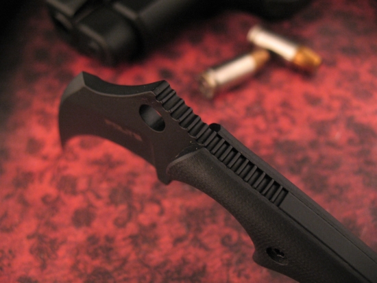 This is a Full Tang Design. It has Custom Thumb Ridges on the Integral Thumb Ramp.