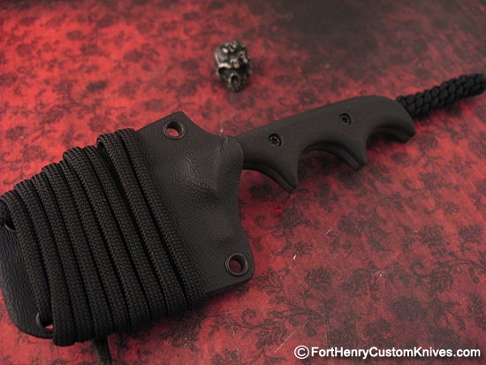 Secure Custom Matching Kydex Neck Sheath with plenty of Paracord and Adjustable keeper, very easy to carry with no noticeable imprint under a T Shirt.