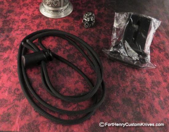 Secure Custom Matching Kydex Neck Sheath with plenty of Paracord and Adjustable keeper, very easy to carry with no noticeable imprint under a T Shirt.