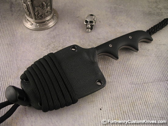 Secure Custom Matching Kydex Neck Sheath with plenty of Paracord and Adjustable keeper, very easy to carry with no noticeable imprint under a T Shirt.