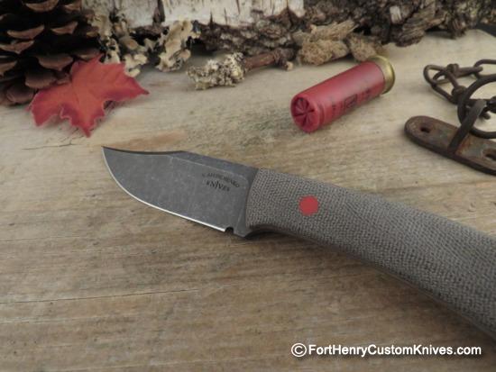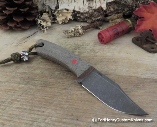 The Handle was crafted from Tough Canvas Micarta. Given a Full Grip, Custom Contoured, Hand Filling Shape this knife is extremely comfortable.