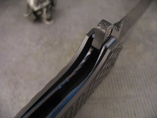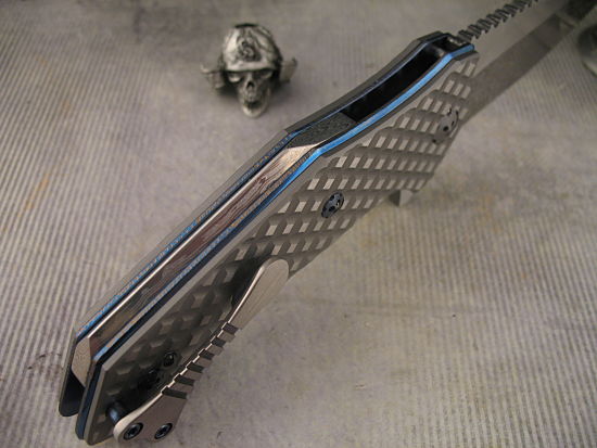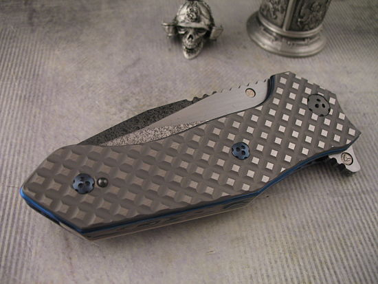 This Kopis has machined titanium handles – coupled with the Anodized Titanium Frame this is a large knife that is still very lightweight and pocket friendly.