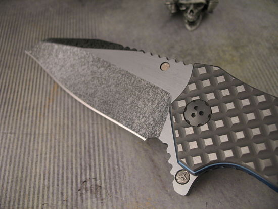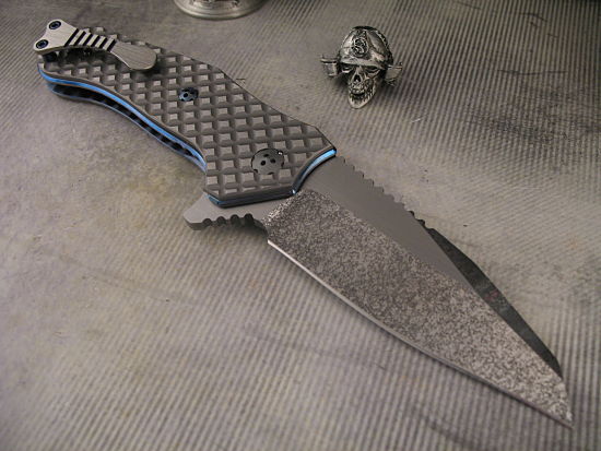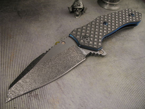 A tough but beautiful knife, wonderful ergonomics in both the handle and the blade. The blade is a RWL with Allen’s Black Snow finish.