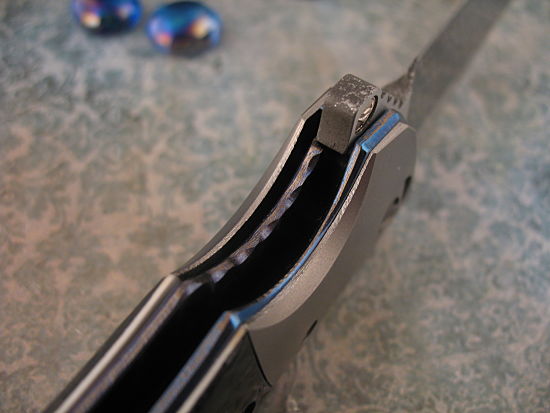 This is Allen Elishewitz’s M2 Flipper with some wonderful upgrades. This one has Beautiful Blue Shred Carbon Fiber handles and Custom Titanium Bolsters.