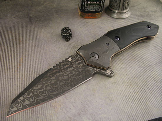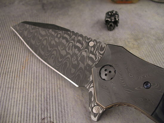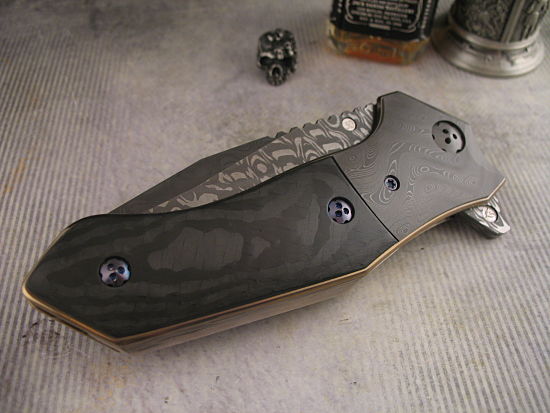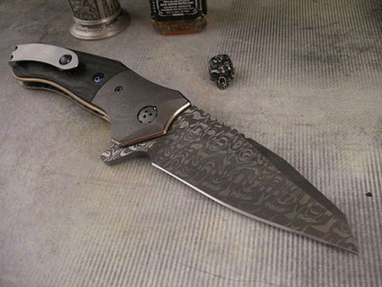 This Kopis has Cheetah Carbon Fiber handles and Damascus bolsters – coupled with the Anodized Titanium Frame this is a large knife that is still very lightweight and pocket friendly.