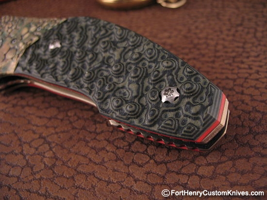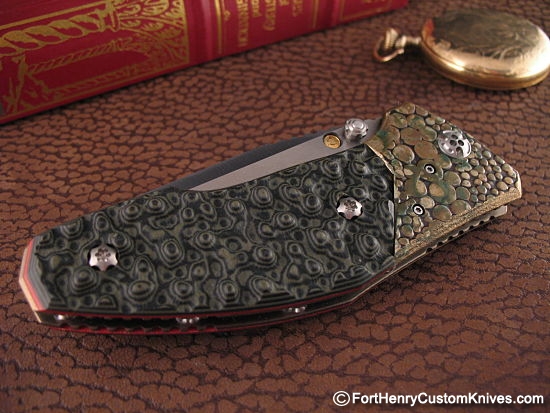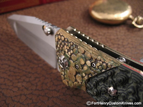 A tough but beautiful knife, wonderful ergonomics in both the handle and the blade. This is a material that I have only seen Allen use a couple of times, it is a tough layered Green/Black G-10 with a deep “Cobblestone” abstract texture with a Forced Patina Brass Textured Bolster