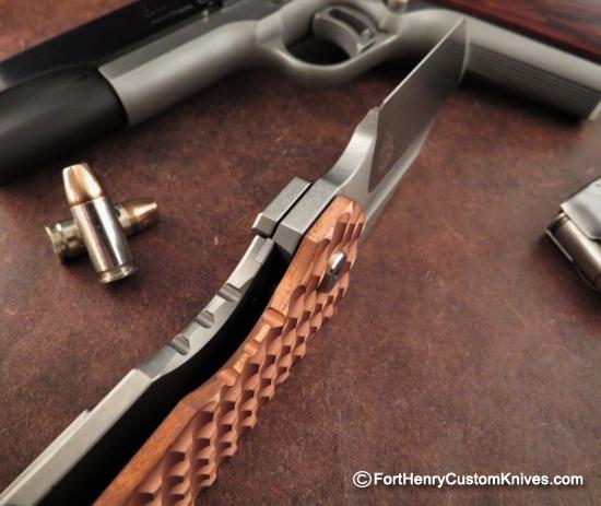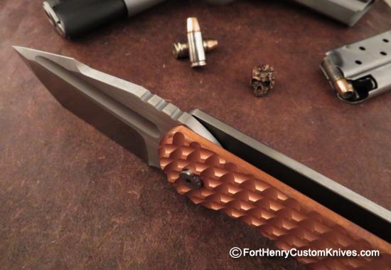 The Alphahunter Apocalypse is a powerful Framelock precision crafted with one of the Thickest Titanium Frames I have seen on a Folder! The Front Scale on this rare knife is Solid Copper giving the knife a hefty, Confidence Inspiring feeling.