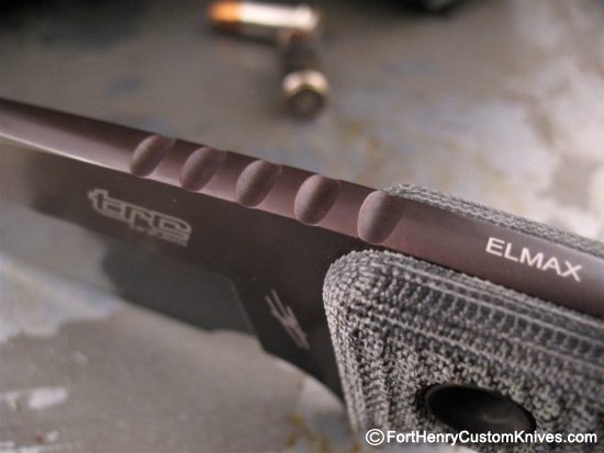 The stout Drop Point Blade has a Comfortable Rounded Spine, with a Long Custom Swedge on each side along with Custom Thumb Ridges.