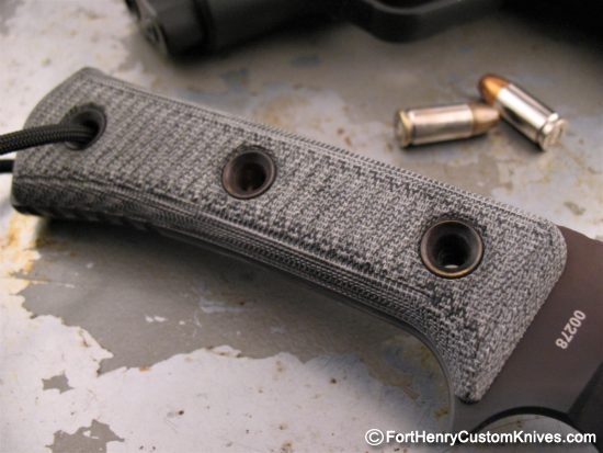 A roughened Surface Texture of the Custom Contoured Micarta handle Scales along with an Expanded Butt on the Handle help to improve the Grip even under adverse conditions.