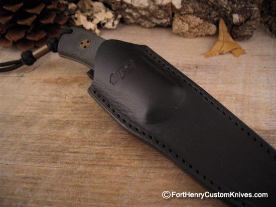 I want to say that I am very impressed with the thick, well fitting Custom Leather Belt sheath that comes with this knife. Excellent Tight Stitching and very nicely finished all the way around. You can not even Shake this knife out of the Sheath!