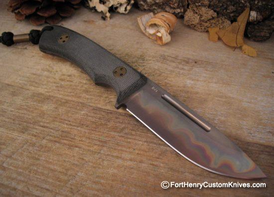 The stout Drop Point Blade has a Comfortable Rounded Spine, with a Fuller on each side along with Custom Thumb Ridges.