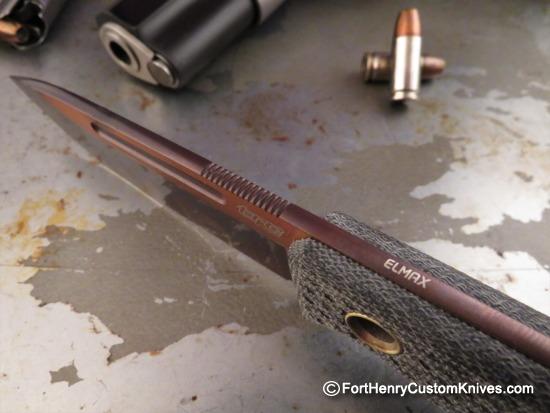 The stout Drop Point Blade has a Comfortable Rounded Spine, with a Fuller on each side along with Custom Thumb Ridges.