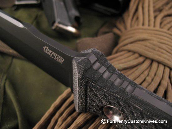 The stout Tanto Blade has a Long Custom Swedge, Thumb Recess for close up work and Custom Traction / Thumb Ridges.