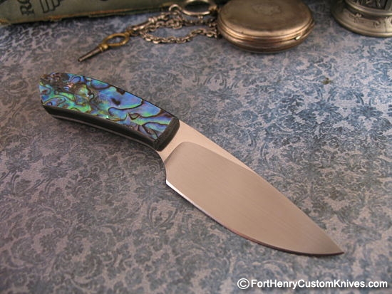 This knife has gorgeous Paua Shell handle Scales that have been Stabilized with a Thick Acrylic for strength. The handles have Deep Ocean Blues, Gold shades and even some Green hues. They are well matched and very well contoured.