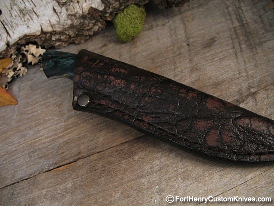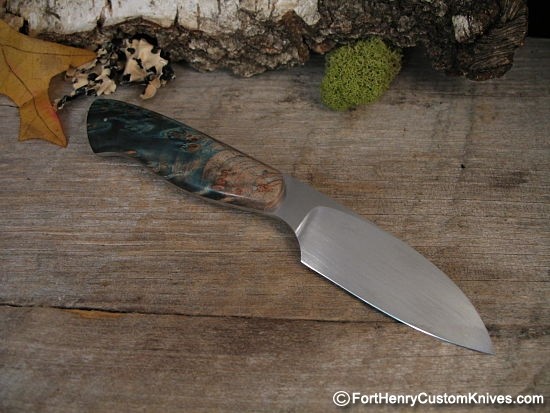 A streamlined, Full Grip EDC sized blade in a modified Wharncliff style. Beautiful Stabilized Green and Brown Maple Butl handle scales that have lots of natural grain and color.