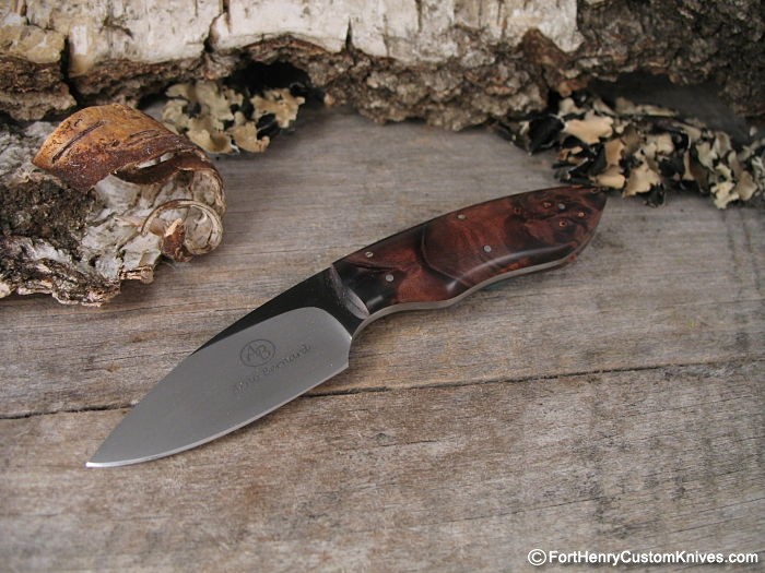 This is wonderful belt knife and small game skinner called the Meerkat. This knife has beautiful Stabilized Maple Burl handles that have deep color and are well matched and well contoured.