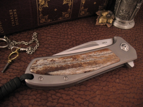 The Glass Bead Blasted Titanium Frame has a smooth Texture and on this Example Arno has added a unique Stabilized Giraffe Shin Bone Inlay on both the front and the back.