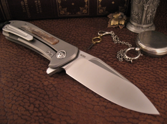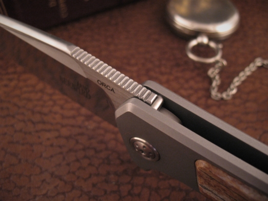 This knife features a Hand Ground M390 blade with a Custom Two Tone finish. The Bevels have a Labor Intensive Mirror Polish and the Flats are Machine Satin. Custom Thumb Ridges on the Spine insure a Secure, Hand Filling Grip when Open.
