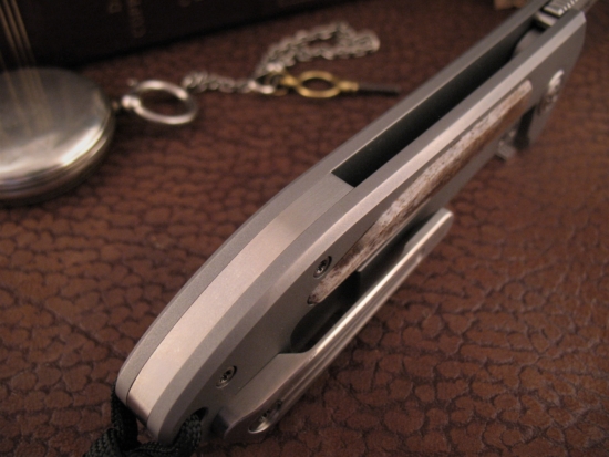 An Artisticly Milled Titanium Low Rider Pocket clip will allow this knife to stay out of sight and ride comfortably deep in your pocket.