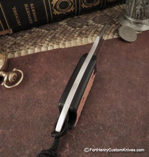This is a Full Tang knife with a Three Finger handle and Unique Handle Material Configuration. The primary portion was made from Black Linen Micarta but it also has some lovely Textured Maple Richlite Inlays on both sides. A Biltsharp Titanium Emblem is inset in the rear of the Handle on the Presentation side.