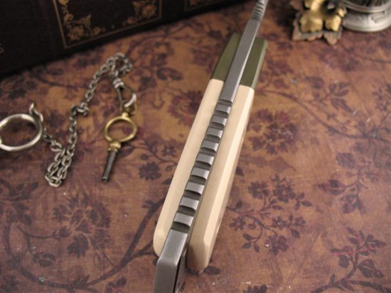 This knife has a Unique Handle Configuration, the Front Bolster is Gold Anodized Titanium while the Rear is Custom Contoured White Paper Micarta.