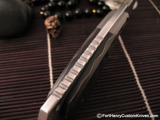 This knife has a Unique New Handle Material called Wild Ribbon Flame Copper Chatoyant Carbon Fiber“, this is a Two Piece Material with Chatoyant Carbon Fiber on top – a Center Ribbon of Copper – and another layer of Black Carbon Fiber underneath.
