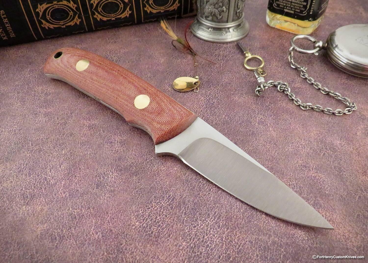 This knife has Natural Canvas Micarta and complimenting Brass blind bolts and a Brass lined Thong hole.