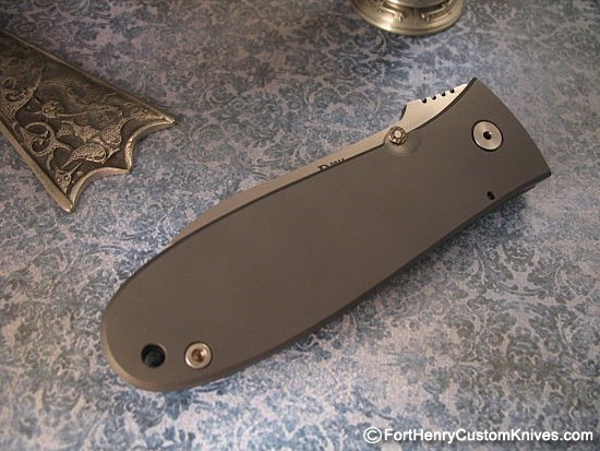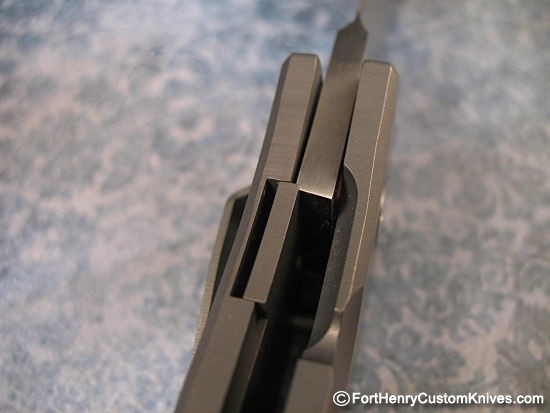 Perfect, early Lock Up! Bob milled out an interior section of the Ti handle and then inset a seperate Ti piece Shaped like a “T” ~ the head of this T is what creates a wide, secure & reliable lock. This inset piece is also replacable!