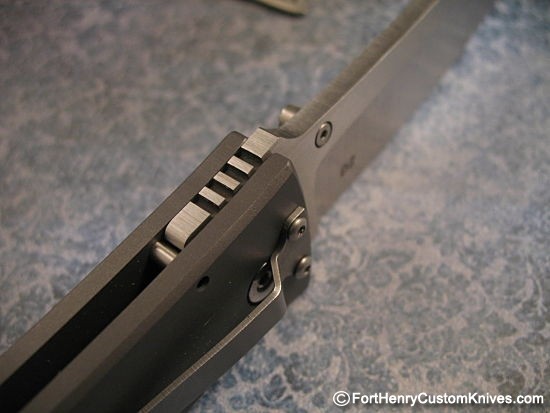 This knife starts with thick Titanium scales but Bob has camferred all edges, no sharp edges anywhere on the handle. The Integral Thumb Ramp has secure Thumb Ridges, they rise just above the handle scales, just enough to enhance the grip.