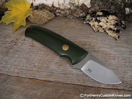 Bob brought three of the these to the Show and knowing how rare they are I purchased all three! A very tough little knife. The Dozier D2 steel blade is almost 1/8″ thick, Full Tang.