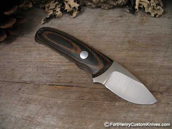 Bob brought three of the these to the Show and knowing how rare they are I purchased all three! A very tough little knife. The Dozier D2 steel blade is almost 1/8″ thick, Full Tang. Rare Triple Camo Burlap Micarta handles have been expertly contoured with full forward finger groove.