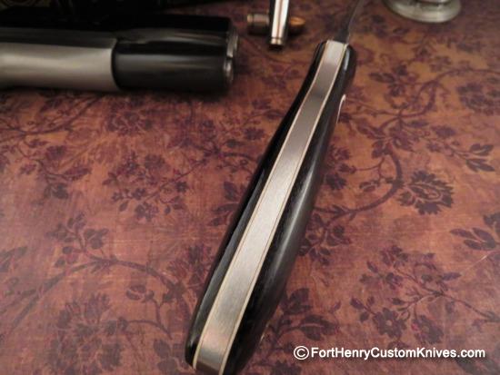 Rich coloring and Natural Grain on the African Blackwood handles with a Brass Blind Bolt and Brass lined Thong hole. Also, an upgrade of a Bullseye Collar of White G-10 around the Brass Bolt.