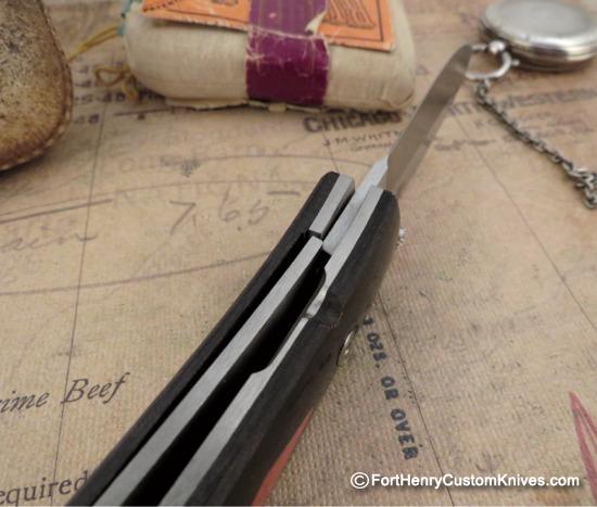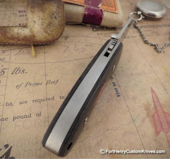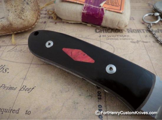 The D2 Blade opens smoothly and the blade has more than enough Cutting Edge to tackle any Every Day Chore and outdoor Field & Stream tasks as well. Bob milled out a small section of the Black Micarta handle (with Stabilized Coral Inlay) to allow for easy access to the RH Thumbstud.