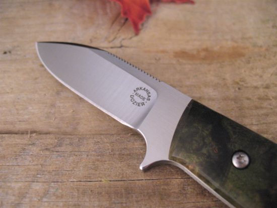 A Full Tang, Modified Drop Point design made from the world renowned Dozier D2 steel. The Gorgeous California Buckeye Burl handle scales have tons of wonderful Natural Grain.