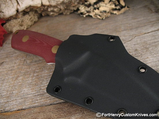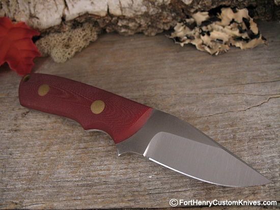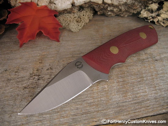 The Coral Red G-10 handles provide a Full Grip ~ they have been Bead Blasted for a sure grip, Brass blind bolts and Brass Lined Lanyard hole. Excellent Wood like Grain to the G-10.