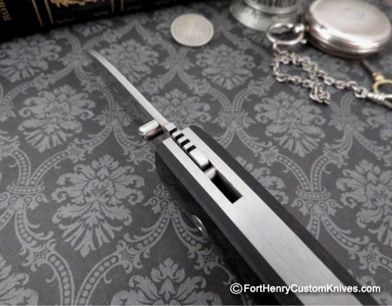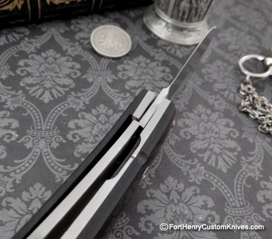 This Dozier Folding Hunter has thick, Satin Finished Titanium liners and a Titanium backspacer. Very nice fit and finish! Extremely Solid and will ride comfortably in your pocket or on your belt.
